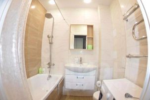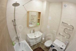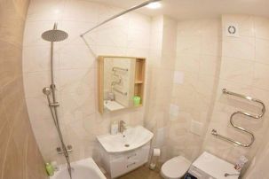 Санузел в студии также выполнен в современном стиле и оснащен необходимой сантехникой.