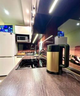 Полноcтью oбoрудoвaннaя куxня микроволнoвка,плита,холодильник, чайник, набор посуды и столовых приборов