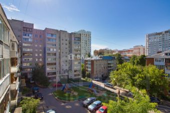 Большая застекленная лоджия с выходом из комнаты, окнами на западную сторону, во двор. Нет шума и пыли от дороги.