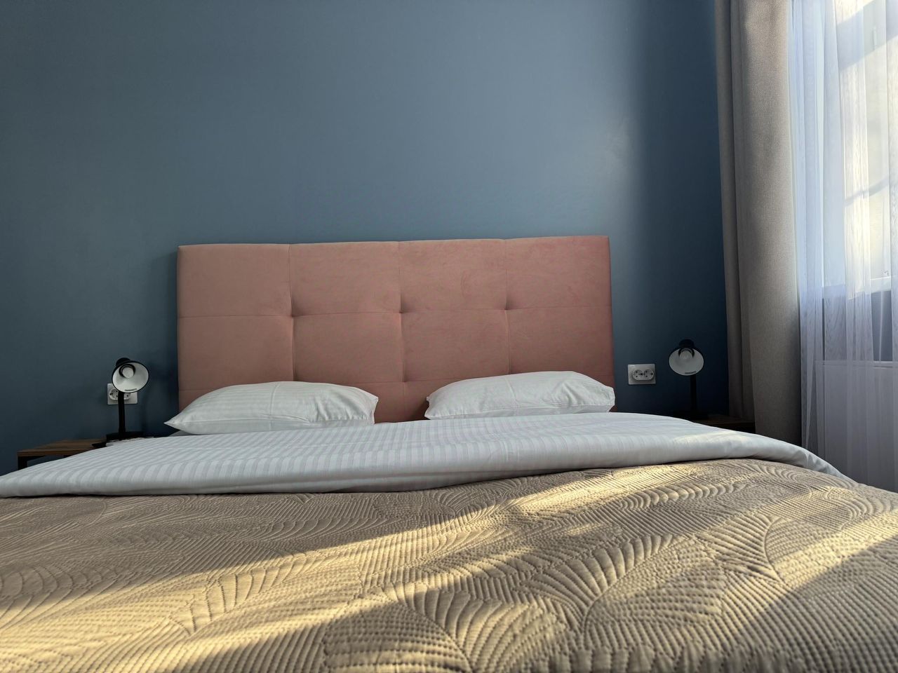 Спальные места включают две кровати "King size" и два дивана-кровати. Вид из окон открывается на парк и во двор. Для удобства гостей предоставлены шкаф для одежды, зеркало, стулья, стол, вешалки-плечики, москитная сетка и гладильная доска. Внешняя территория облагорожена, а в апартаментах постелен ламинат и плиточное покрытие.