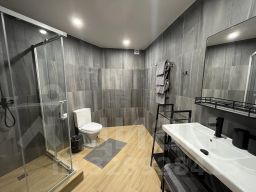 В ванной комнате есть душевая кабина, ванна, раковина и туалетные принадлежности.