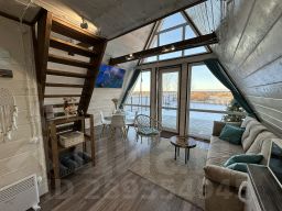 Предлагаем для посуточной аренды гостевой дом "Над Рекой" в стиле A-frame в уникальном месте, на самом берегу реки с шикарным панорамным видом! Расположенный в природном заказнике регионально значения и всего в 115 км. от Москвы!