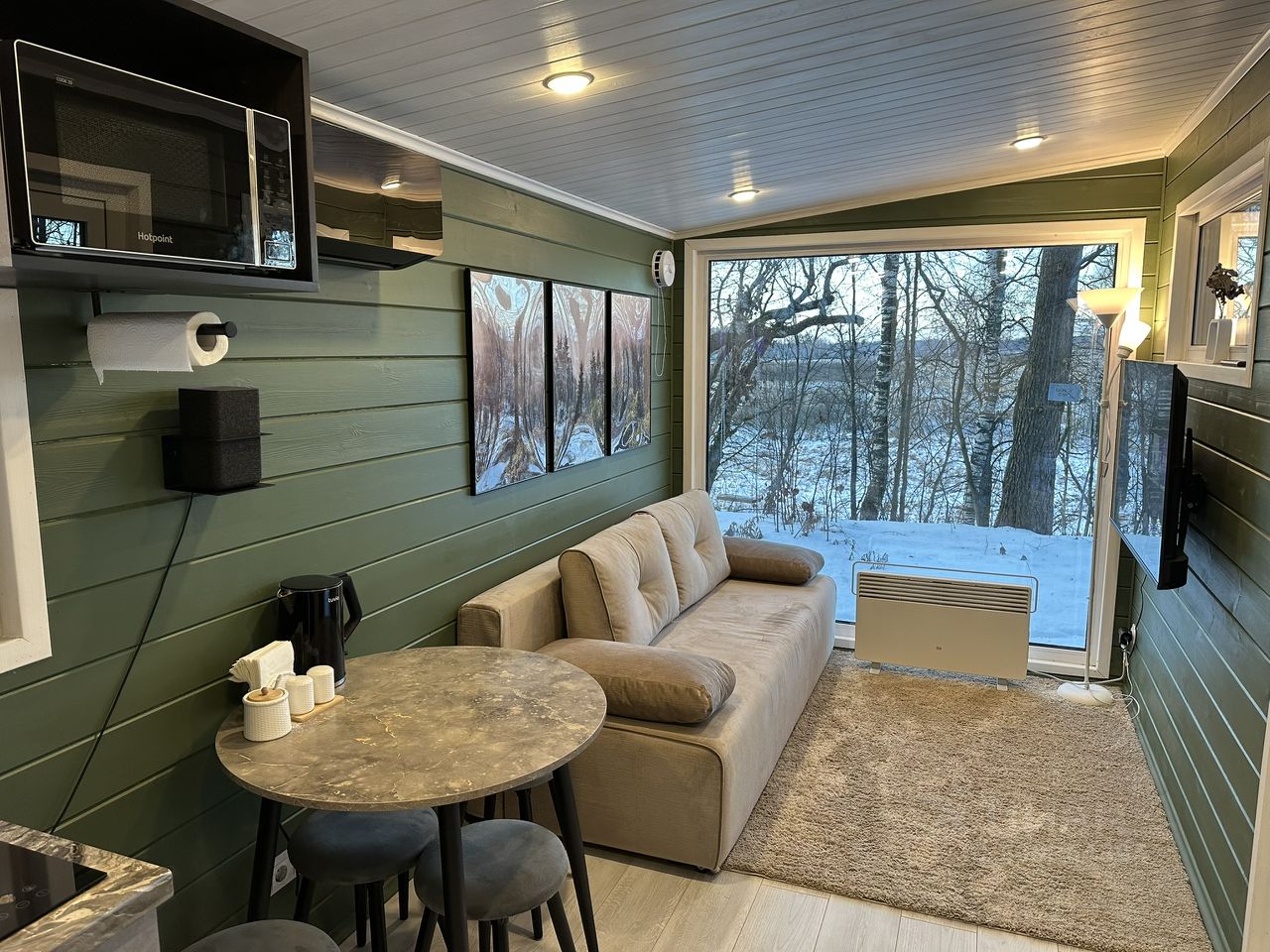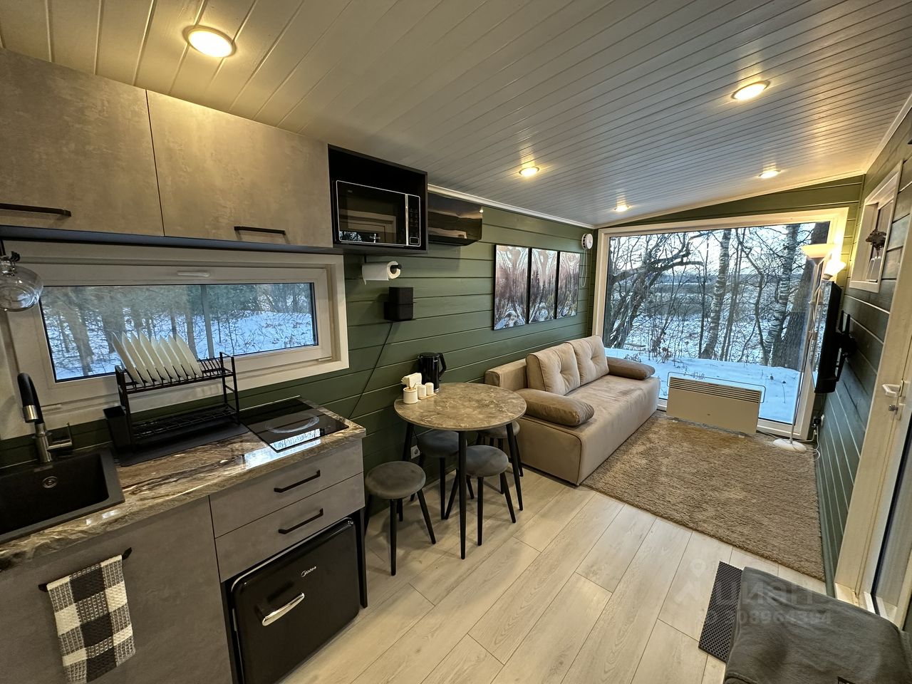 Кондиционер, индукционная плита, СВЧ печь, холодильник, посуда и приборы, чайник, а также решётка для барбекю зоны, фен, полотенца, умный радиатор отопления Xiaomi, бойлер с горячей водой, теплый пол в ванной комнате.