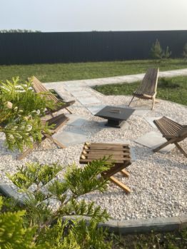 Территория — это отдельная история. Клумбы, аккуратные дорожки, крытая терраса с плетёной мебелью и гирляндами, которые вечером превращают её в сказочный уголок. А ещё — всего 3 минуты на машине до аквапарка Суздаль Аква, где вас ждут не только водные развлечения, но и живописная набережная с пляжем.
