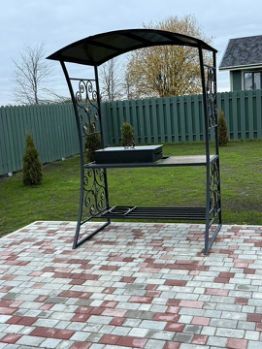 -мангальная зона с мангалом, шампурами и комфортной скамейкой.