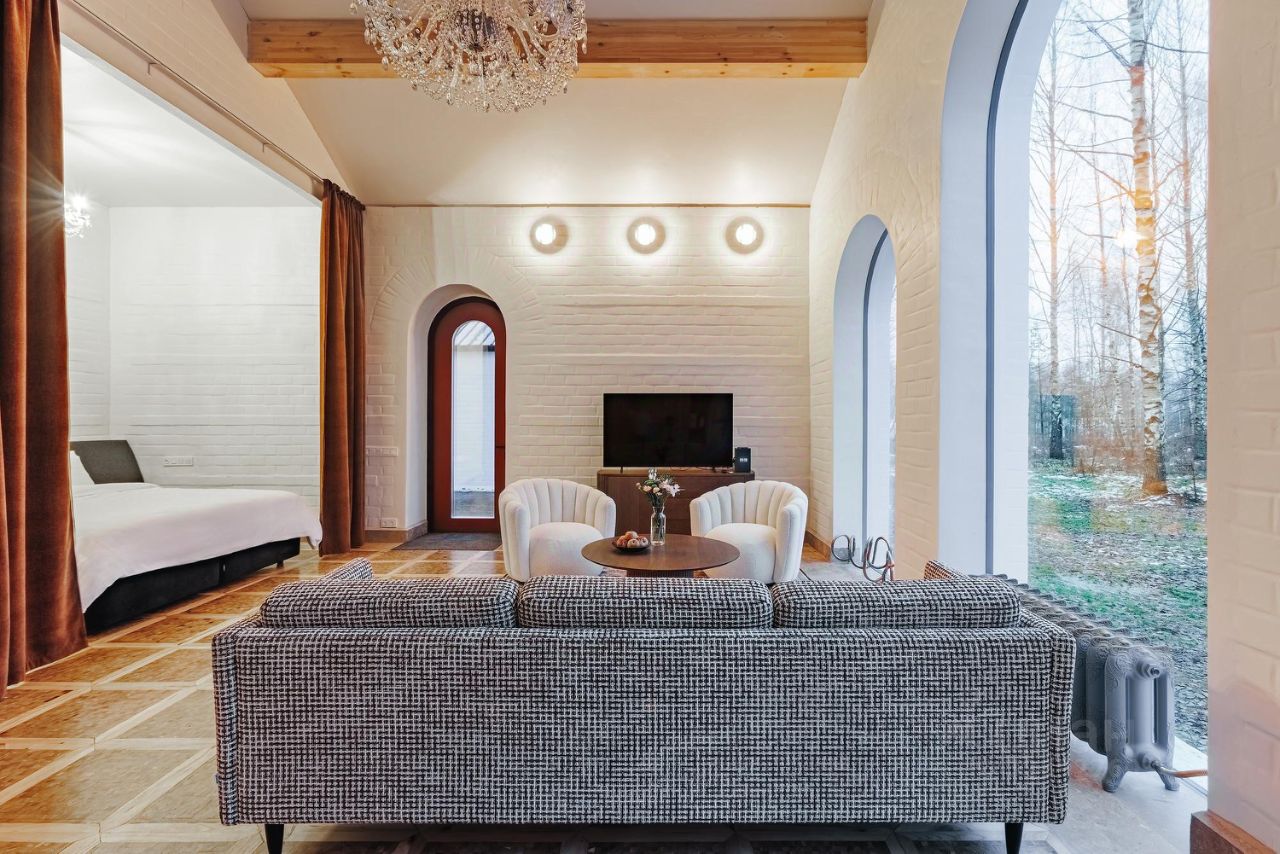 Интерьер домов оформлен в современном классическом стиле с использованием натурального дерева, камня и премиального текстиля. Баланс цветовой гаммы располагает к максимальному воссоединению с природой. Из панорамных окон открываются впечатляющие виды на березовый лес и живописные поля идеальное место, чтобы встретить рассвет за чашкой кофе или проводить день в спокойствии и тишине.