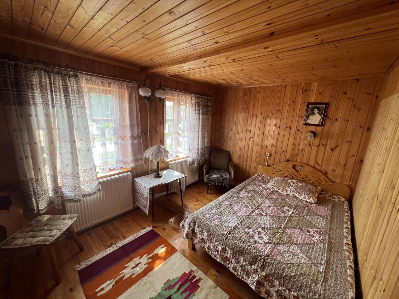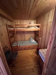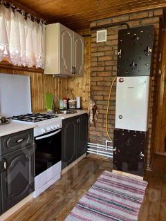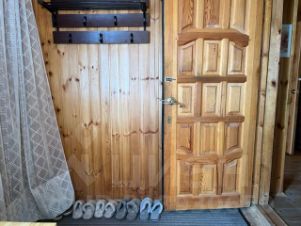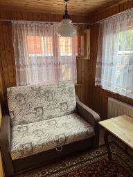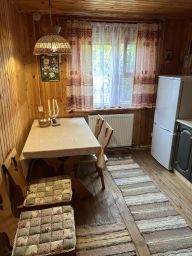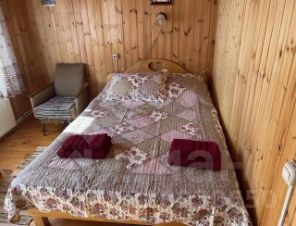 Дом рассчитан на проживание 4-5 человек. В доме две комнаты и веранда. В одной комнате двухспальная кровать, во второй двухярусная кровать, на веранде диван, кухня обустроена кухонным гарнитуром, холодильником, микроволновой печью, электрочайником, в санузле ванна и туалет.