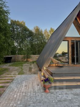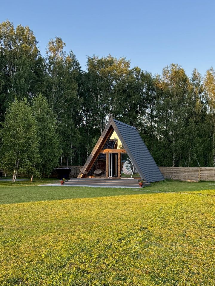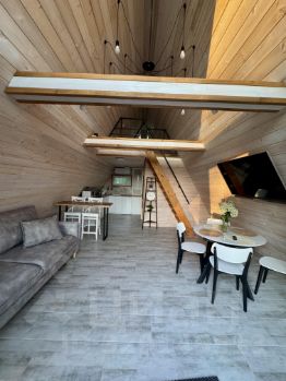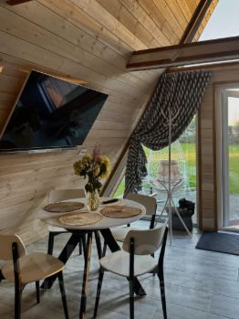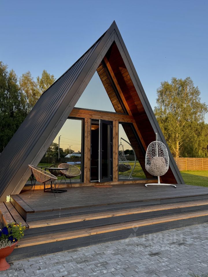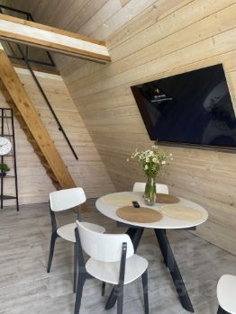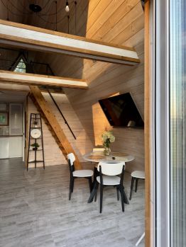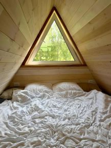 Домик A-frame— До 4 человек— 2 большие спальные зоны, мягкий диван, кухня с посудой, микроволновка, душ с видом на лес— Веранда с мангальной зоной, столом и стульями