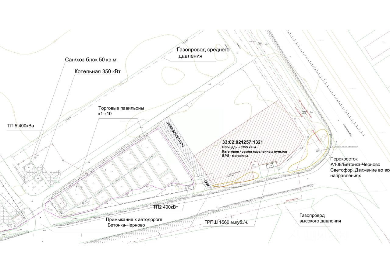 Продается земельный участок, категория - земли населенных пунктов, вид разрешенного использования - "магазины". Площадь 0,535 Га, кадастровый номер 33:02:021527:1321, расположенный на перекрестке автомагистрали А108 и автодороги Бетонка-Черново, в первой линии. Въезд с обоих автодорог. В объем предложения входят указанные земельные участки, электричество - до 150 кВа от двух ТП, газоснабжение до 100 м.куб./час.
