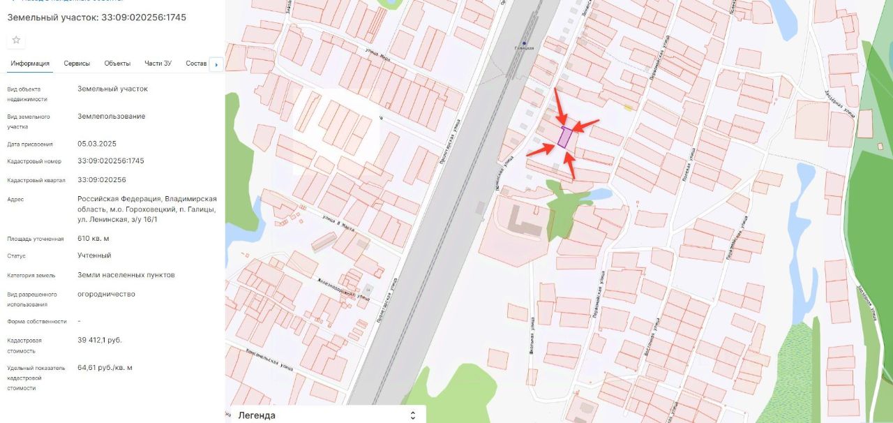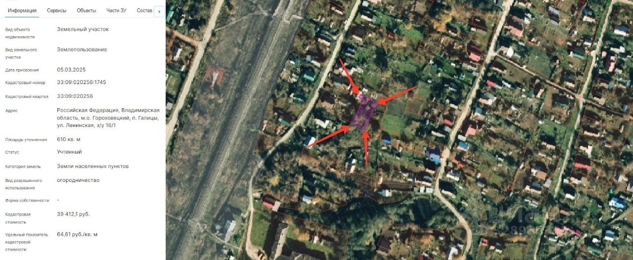 Земельный участок из категории земель населенных пунктов с кадастровым номером 33:09:020256:1745 , площадью 610 кв.м, Вид разрешенного использования - огородничество. С ограничениями: транспортная доступность участка не обеспечена существующей дорожной сетью. (претендент считается ознакомленным с фактическим состоянием и характеристиками участка, в том числе и с отсутствием подъездных путей, путем самостоятельного осмотра местности). Местоположение: Российская Федерация, Владимирская область, Гороховецкий район, МО Куприяновское (сельское поселение), п. Галицы, ул. Ленинская.