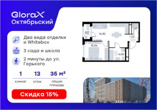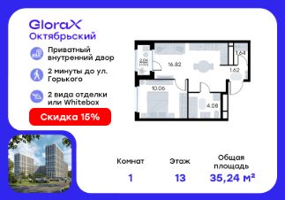 Продается 1-комн. квартира на 13-м этаже в строящемся проекте комфорт-класса GloraX Октябрьский. Общая площадь лота составляет 35,24 кв. м, из которых 10,06 кв. м отведено под жилую и 16,82 кв. м под кухонную зону. Номер квартиры - 144.