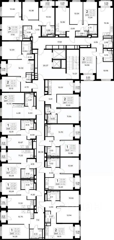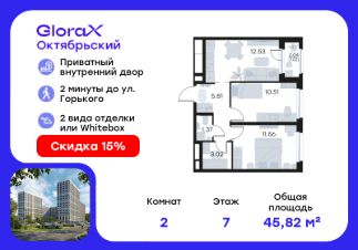 Продается 2-комн. квартира на 7-м этаже в строящемся проекте комфорт-класса GloraX Октябрьский. Общая площадь лота составляет 45,82 кв. м, из которых 22,07 кв. м отведено под жилую и 12,53 кв. м под кухонную зону. Номер квартиры - 261.