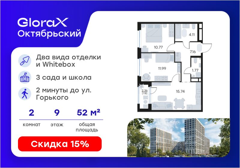 Отличительное преимущество GloraX Октябрьский — видовые квартиры на верхних этажах. Все помещения сдаются уже с предчистовой отделкой. Вы сможете сразу переехать и начать жить в новом доме.