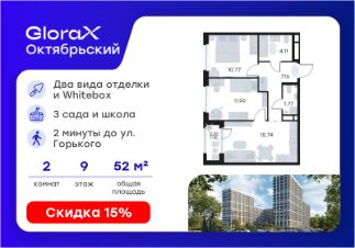 Продается 2-комн. квартира на 9-м этаже в строящемся проекте комфорт-класса GloraX Октябрьский. Общая площадь лота составляет 52,72 кв. м, из которых 22,76 кв. м отведено под жилую и 15,74 кв. м под кухонную зону. Номер квартиры - 544.