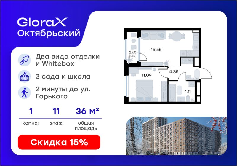 Продается 1-комн. квартира на 11-м этаже в строящемся проекте комфорт-класса GloraX Октябрьский. Общая площадь лота составляет 36,40 кв. м, из которых 11,09 кв. м отведено под жилую и 15,55 кв. м под кухонную зону. Номер квартиры - 697.