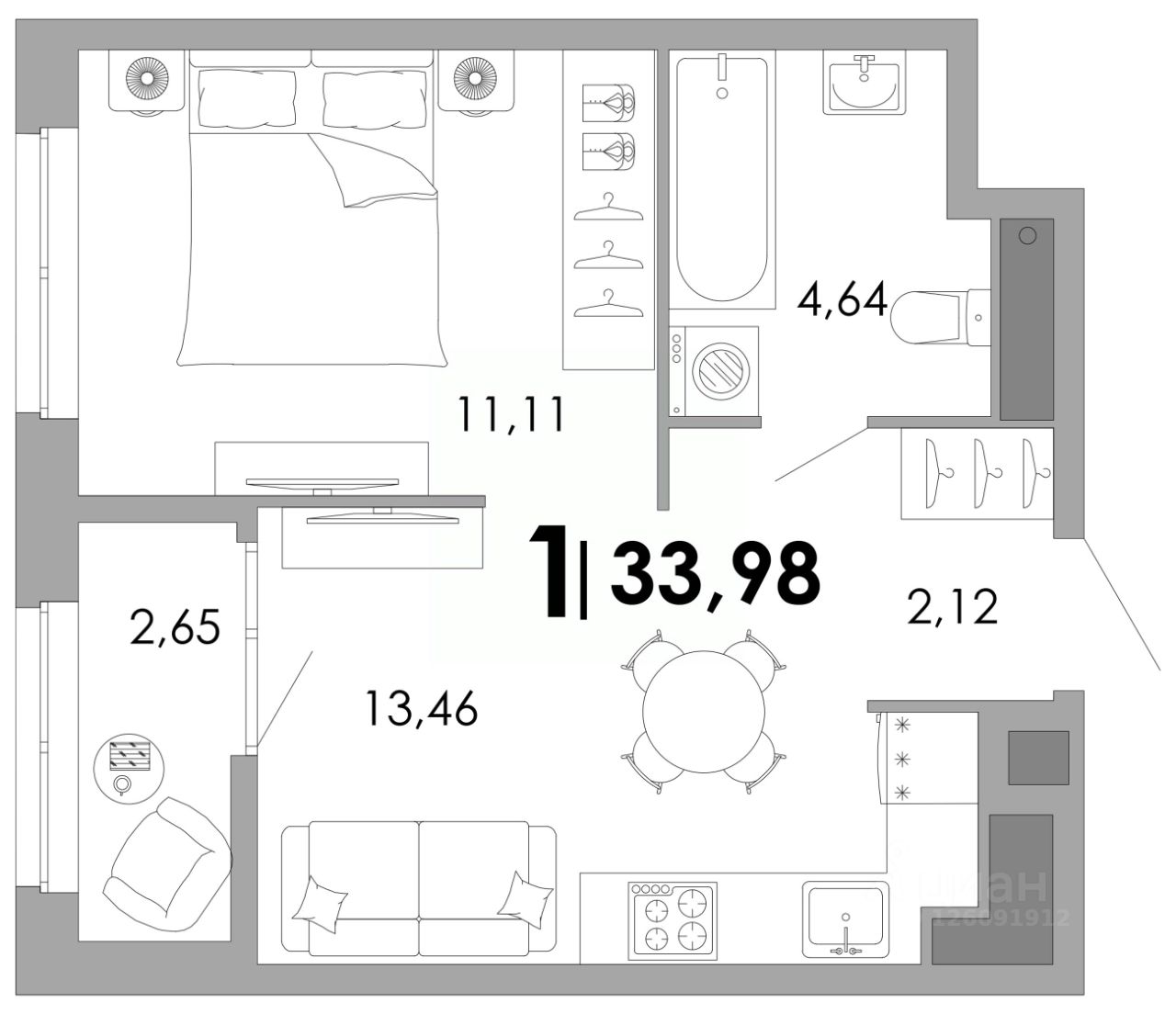 Общая площадь33,98 м²
