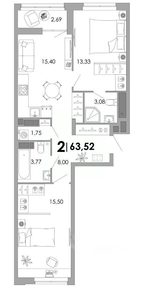 Общая площадь63,52 м²