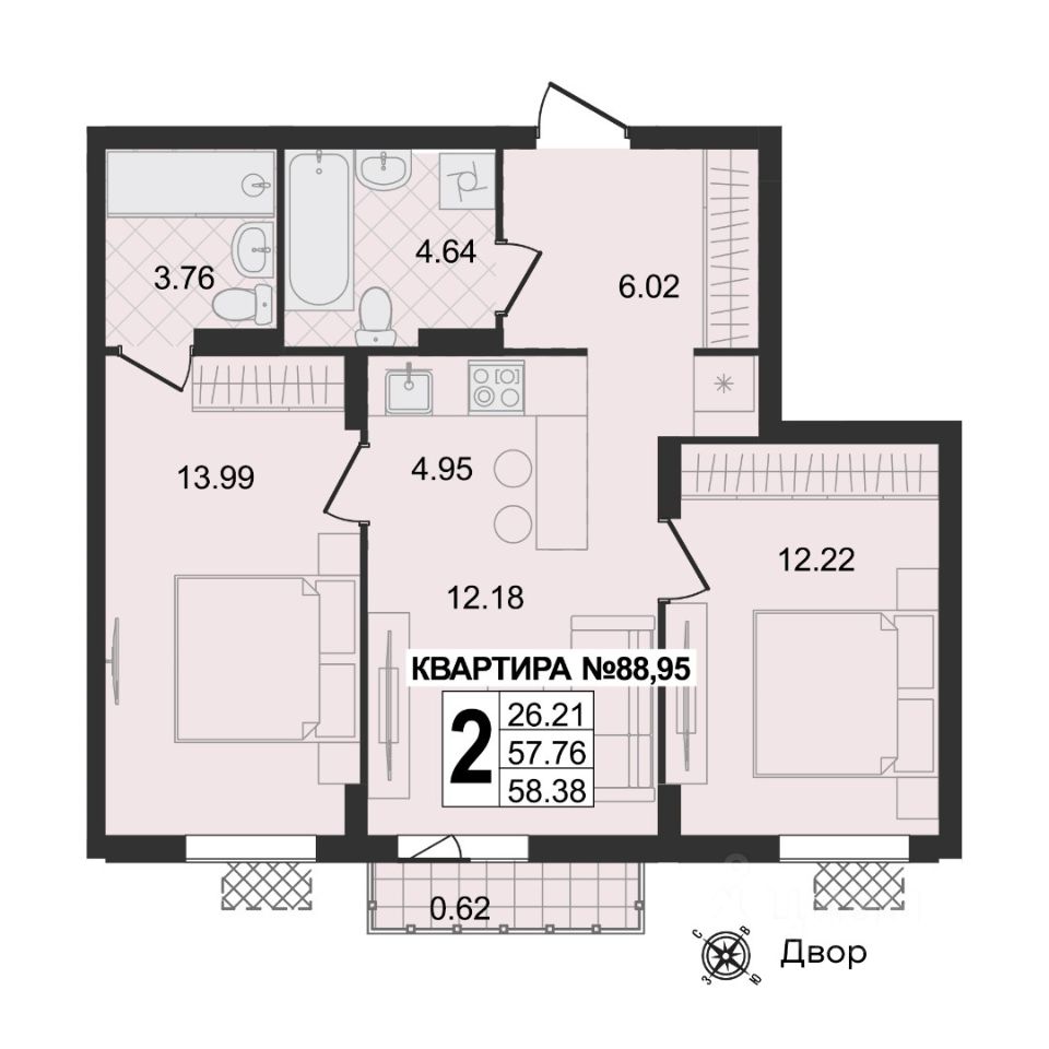 Продаётся 2-комнатная квартира в строящемся доме (Корпус 1 квартал 9), срок сдачи: III-кв. 2029, общей площадью 58.38 кв.м., на 3 этаже.