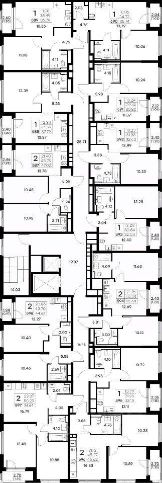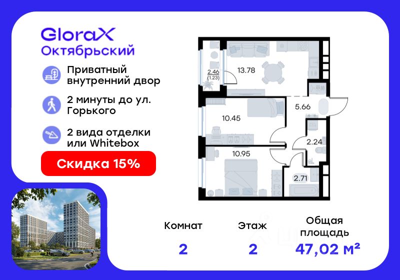 Продается 2-комн. квартира на 2-м этаже в строящемся проекте комфорт-класса GloraX Октябрьский. Общая площадь лота составляет 47,02 кв. м, из которых 21,40 кв. м отведено под жилую и 13,78 кв. м под кухонную зону. Номер квартиры - 587.
