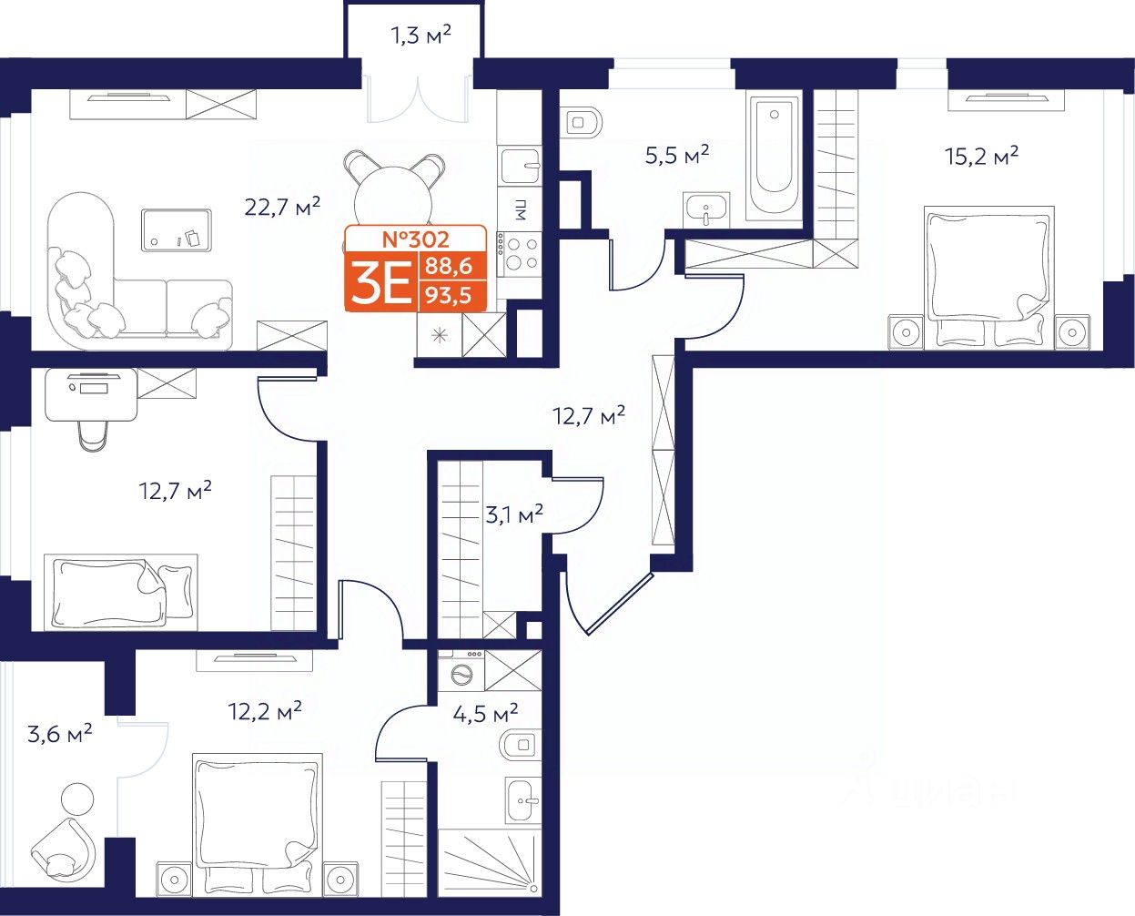 Продается 3-комнатная квартира 302 в Квартале "Новаторов" комфорт-класса.