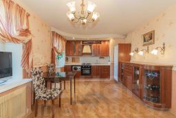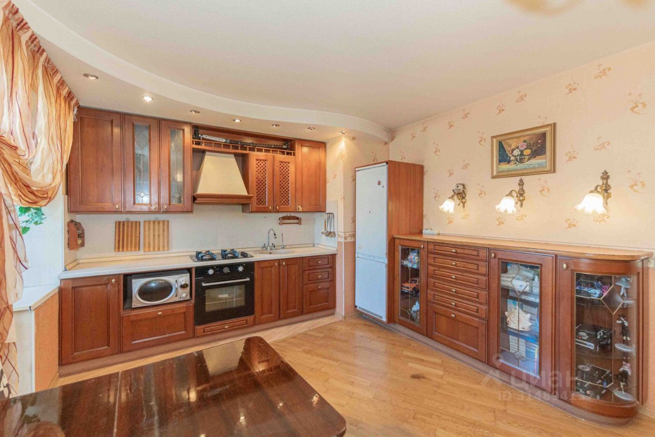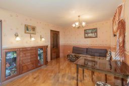 Кухонный гарнитур из дерева, в отличном состоянии, с дополнительными элементами (сервант, комод, стол, стулья). Так же остаётся отличная духовка и холодильник. На полу паркет и зонирование кухни кафелем. Потолки навесные.