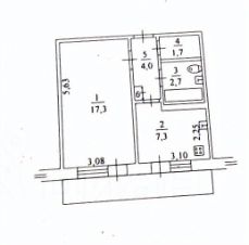 Комната 17,3 кв.м, кухня 7,3 кв.м., с/узел совмещен.