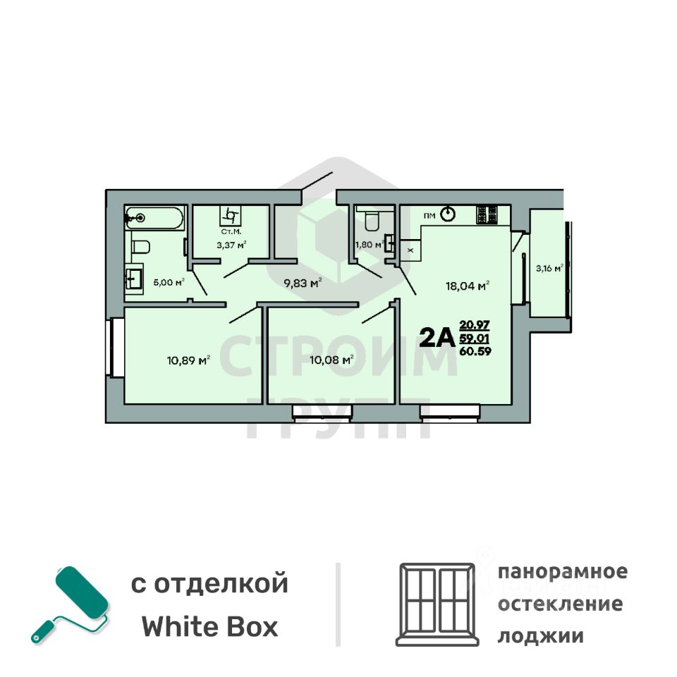 Особенностью этой двухкомнатной квартиры является объединенная с кухней гостиная общей площадью 18 квадратных метров. Помещение разделено на зоны для приготовления пищи, где можно установить кухонный гарнитур и большой обеденный стол для всей семьи, и ТВ-зону, где поместится хороший просторный диван. Из комнаты имеется выход на просторную лоджию площадью 3,16 квадратных метра. При сдаче дома лоджия будет остеклена! При такой планировке совмещенной кухни и гостиной, неоспоримым преимуществом этой двухкомнатной квартиры являются две отдельные комнаты. Одну из них, площадью почти 11 квадратных метров, можно использовать под спальную комнату, где можно установить широкую кровать или раскладной диван и вместительный шкаф для одежды. Вторую комнату, площадью 10 квадратных метров, можно использовать в качестве детской или кабинета. Интересным и полезным решением в этой двухкомнатной квартире стали два санузла! Один - полноценный, площадью 5 квадратных метров, где можно установить раковину, ванну и унитаз, а второй - небольшой, площадью 1,8 квадратных метра, с отдельным унитазом и раковиной. Для семьи с детьми - очень актуальное решение. Также рядом с большим санузлом есть отдельное просторное помещение площадью более 3 квадратных метров, которое можно использовать в качестве постирочной комнаты или гардероба. В большом коридоре с холлом (почти 10 квадратных метров!) при входе в квартиру предусмотрено место для установки вместительного шкафа для хранения вещей. Доступны такие способы покупки, как наличные, ипотека от ведущих банков (в т.ч. все программы с субсидиями и господдержка), ипотека со снижением ставки за счёт застройщика, рассрочка до 2 лет напрямую от застройщика. В цену квартиры сразу входит ремонт в формате White Box с гарантией на все работы!