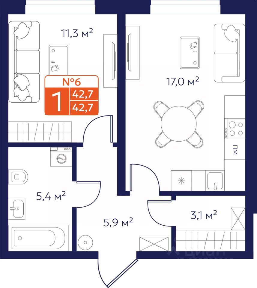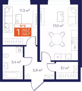 Продается 1-комнатная квартира 6 в Квартале "Новаторов" комфорт-класса.