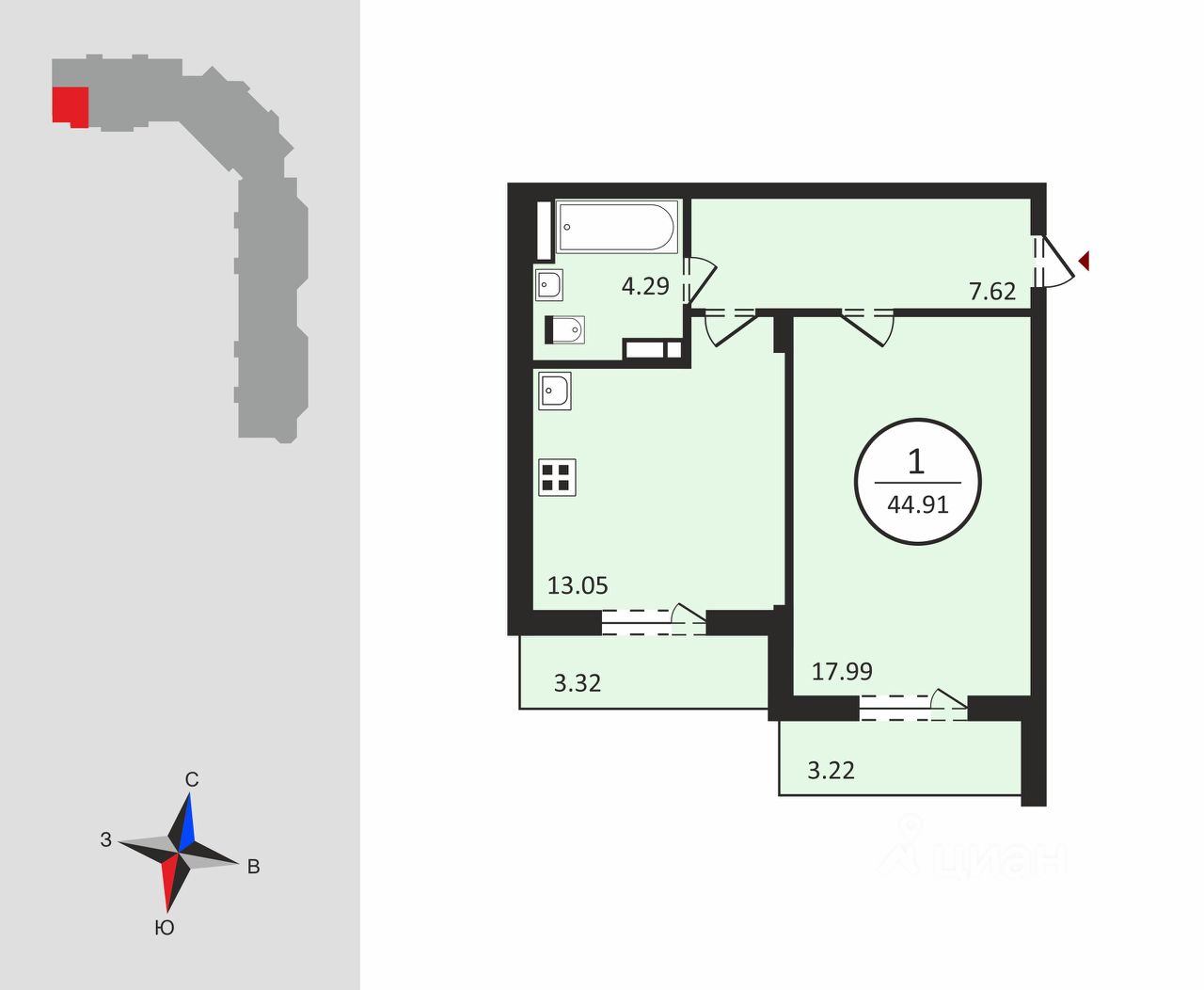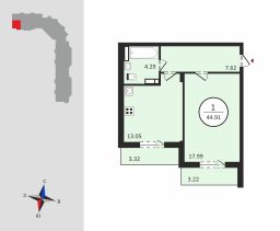 Общая площадь квартиры составляет 42,9 кв. м, из которых 18 кв. м — жилая площадь, 13 кв. м — кухня. Два балкона делают квартиру ещё более функциональной и уютной. Окна выходят на улицу и во двор, а не угловая планировка обеспечивает дополнительную теплоизоляцию и комфорт.