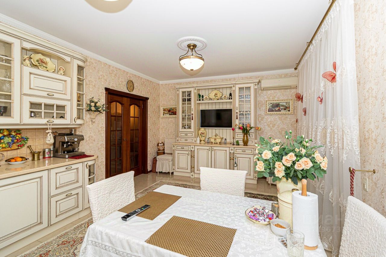 Кухня 23,3 кв.м, гостиная-зал 43,4 кв.м, 4 санузла, 2 спальни, кабинет-библиотека 42,8 кв.м, зимний сад и лоджия, бильярдный зал, сауна, гараж..