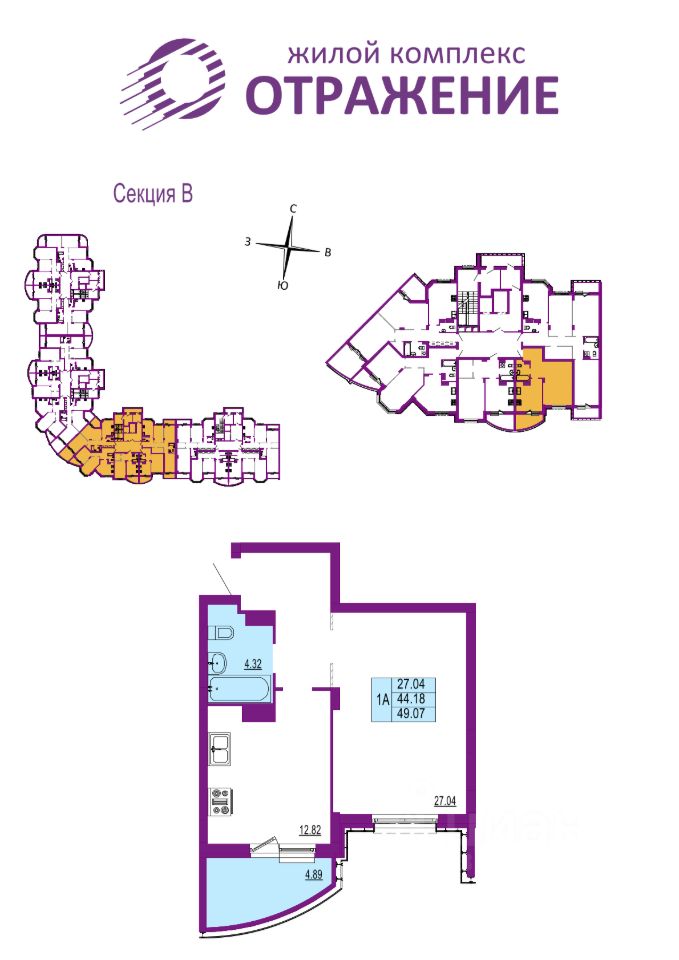 Квартира 76, секция В, Корпус 1( ЗУ-1) в новостройке напрямую от ЗАСТРОЙЩИКА.