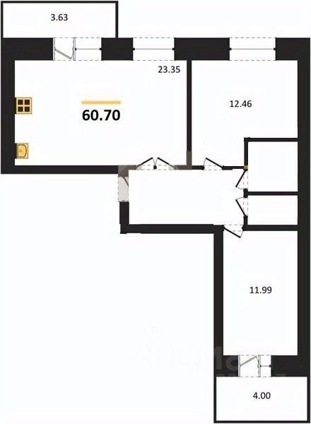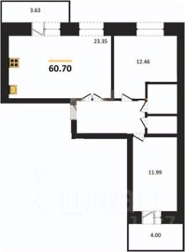 Общая площадь квартиры — 60,7 кв. м, жилая — 25 кв. м, площадь кухни — 23,3 кв. м. Две комнаты площадью 12 и 13 кв. м идеально подойдут для семьи.