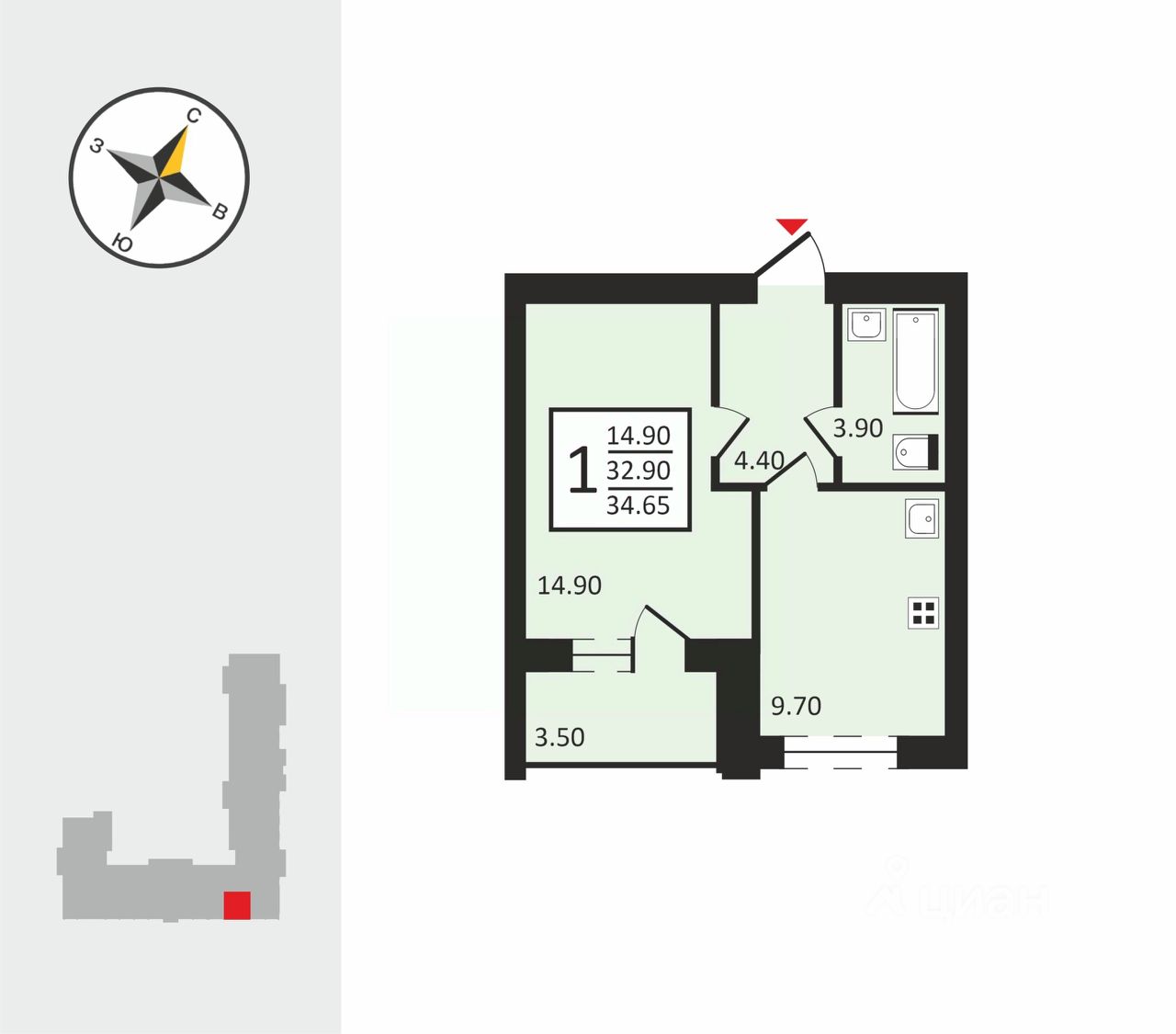 Просторная планировка: общая площадь квартиры составляет 34,65 кв. м, из которых 14,9 кв. м — жилая площадь, а 9,7 кв. м — кухня. Комнаты изолированы, что обеспечивает комфорт и уединение.