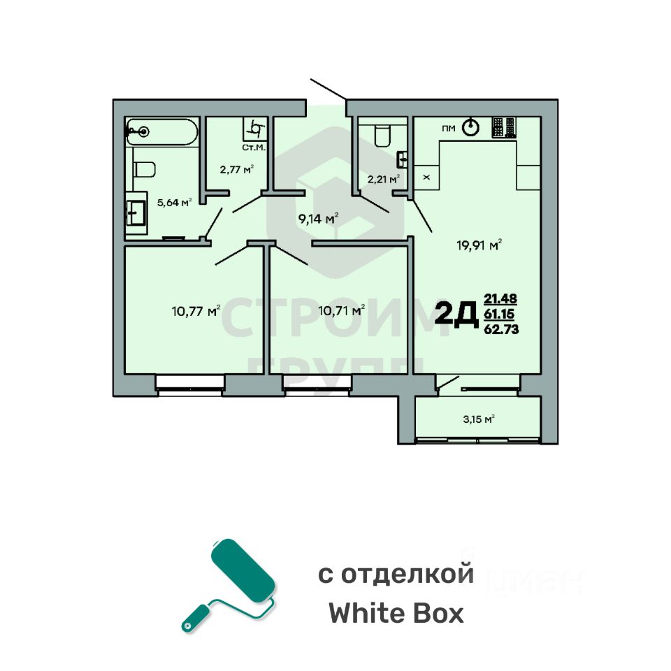 Особенностью этой двухкомнатной квартиры является объединенная с кухней гостиная общей площадью почти 20 квадратных метров! Помещение разделено на зоны для приготовления пищи, где можно установить кухонный гарнитур и большой обеденный стол для всей семьи, и ТВ-зону, где поместится хороший просторный диван. Из комнаты имеется выход на просторную лоджию площадью 3,15 квадратных метра. При сдаче дома лоджия будет остеклена! При такой планировке совмещенной кухни и гостиной, неоспоримым преимуществом этой двухкомнатной квартиры являются две отдельные комнаты площадью почти 11 квадратных метров каждая. Одну из них можно использовать под спальную комнату с размещением там широкой кровати или раскладного дивана. Предусмотрено место под вместительный шкаф для одежды. Вторую комнату можно использовать в качестве детской или кабинета. Интересным и полезным решением в этой двухкомнатной квартире стали два санузла! Один - полноценный, площадью 5,6 квадратных метра, где можно установить раковину, ванну и стиральную машину, а второй - небольшой, площадью 2,2 квадратных метра, с отдельными унитазом и раковиной. Для семьи с детьми - очень актуальное решение. Обратите внимание - рядом с большим санузлом есть отдельное помещение площадью почти 2,8 квадратных метра, которое можно использовать в качестве постирочной комнаты или гардероба. Просторная прихожая является непроходной. Изолированность прихожей позволяет держать в чистоте остальные помещения квартиры грязь с улицы не будет разноситься по комнатам. Доступны такие способы покупки, как наличные, ипотека от ведущих банков (в т.ч. все программы с субсидиями и господдержка), ипотека со снижением ставки за счёт застройщика, рассрочка до 2 лет напрямую от застройщика. В цену квартиры сразу входит ремонт в формате White Box с гарантией на все работы!