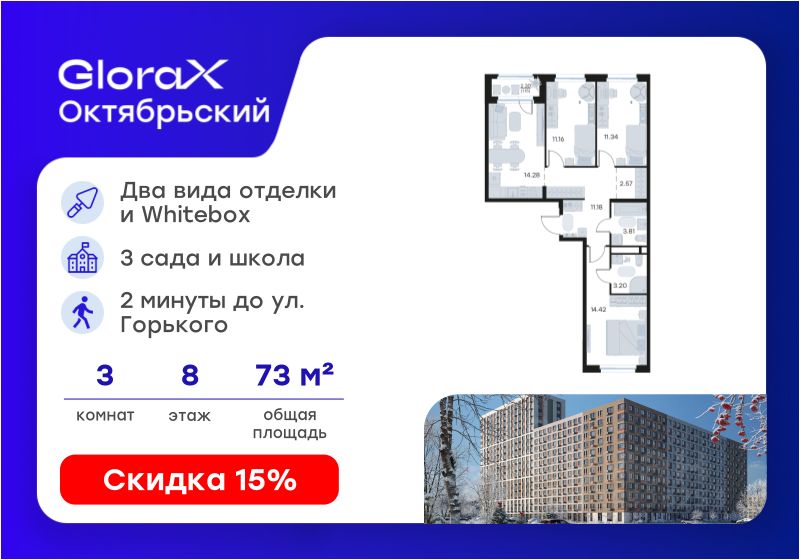 Продается 3-комн. квартира на 8-м этаже в строящемся проекте комфорт-класса GloraX Октябрьский. Общая площадь лота составляет 73,11 кв. м, из которых 36,92 кв. м отведено под жилую и 14,28 кв. м под кухонную зону. Номер квартиры - 400.
