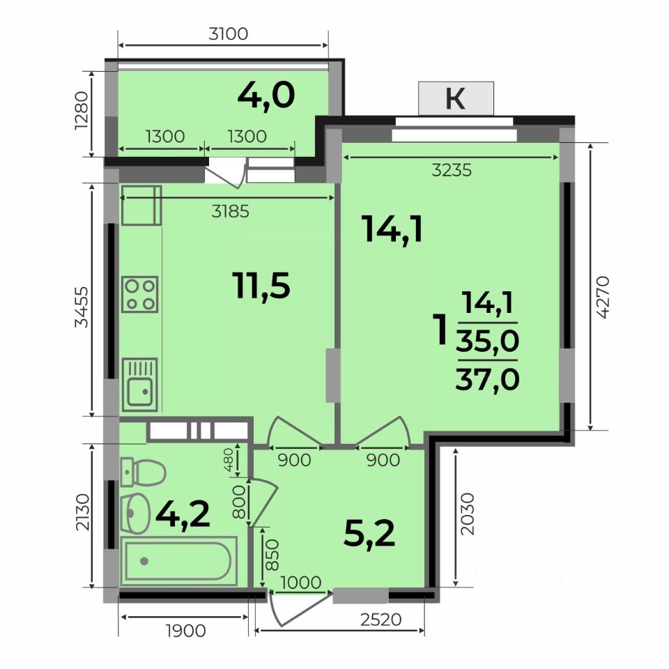 Общая площадь37 м²