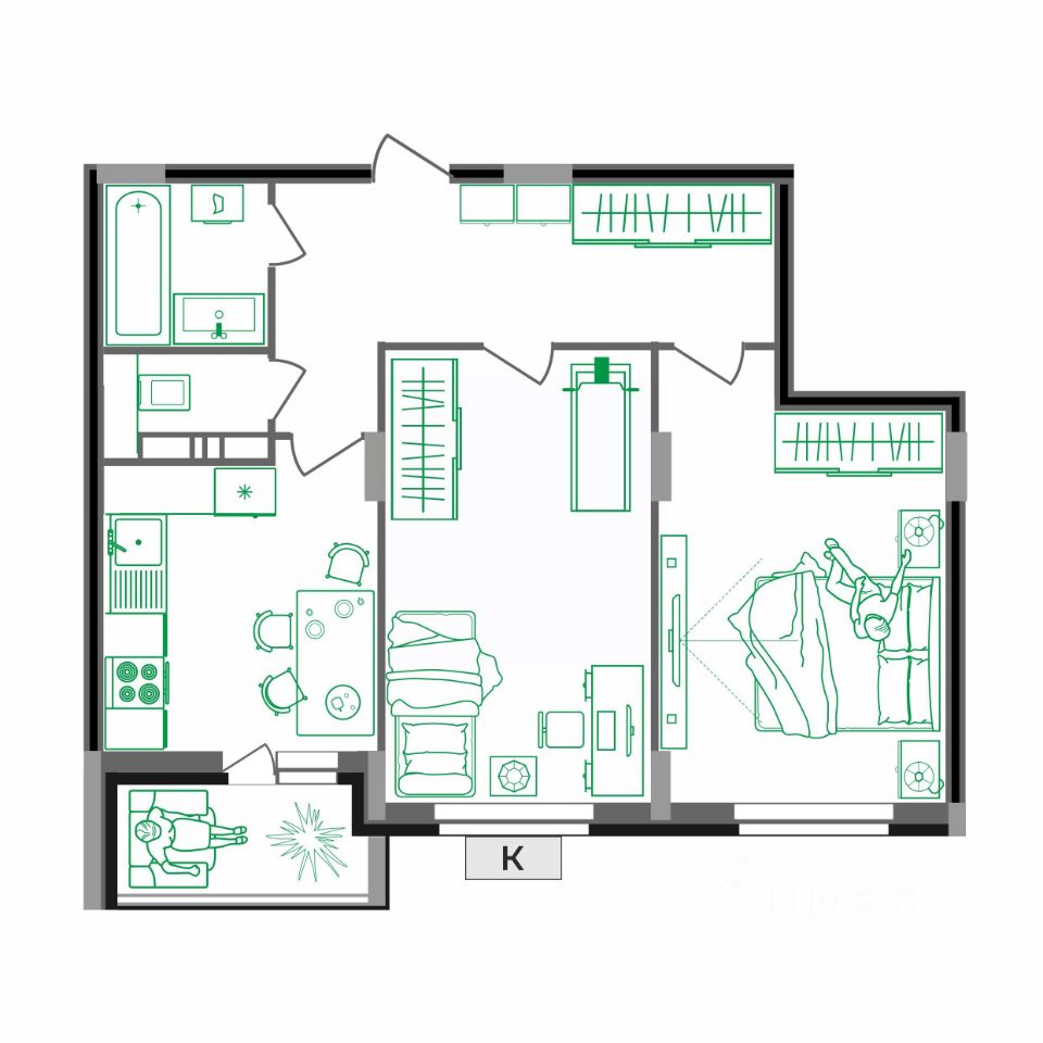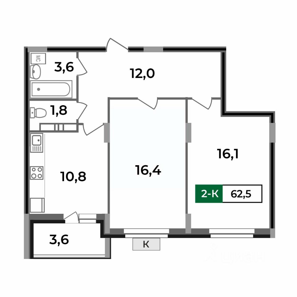 — две жилые комнаты 16 кв.м правильной формы