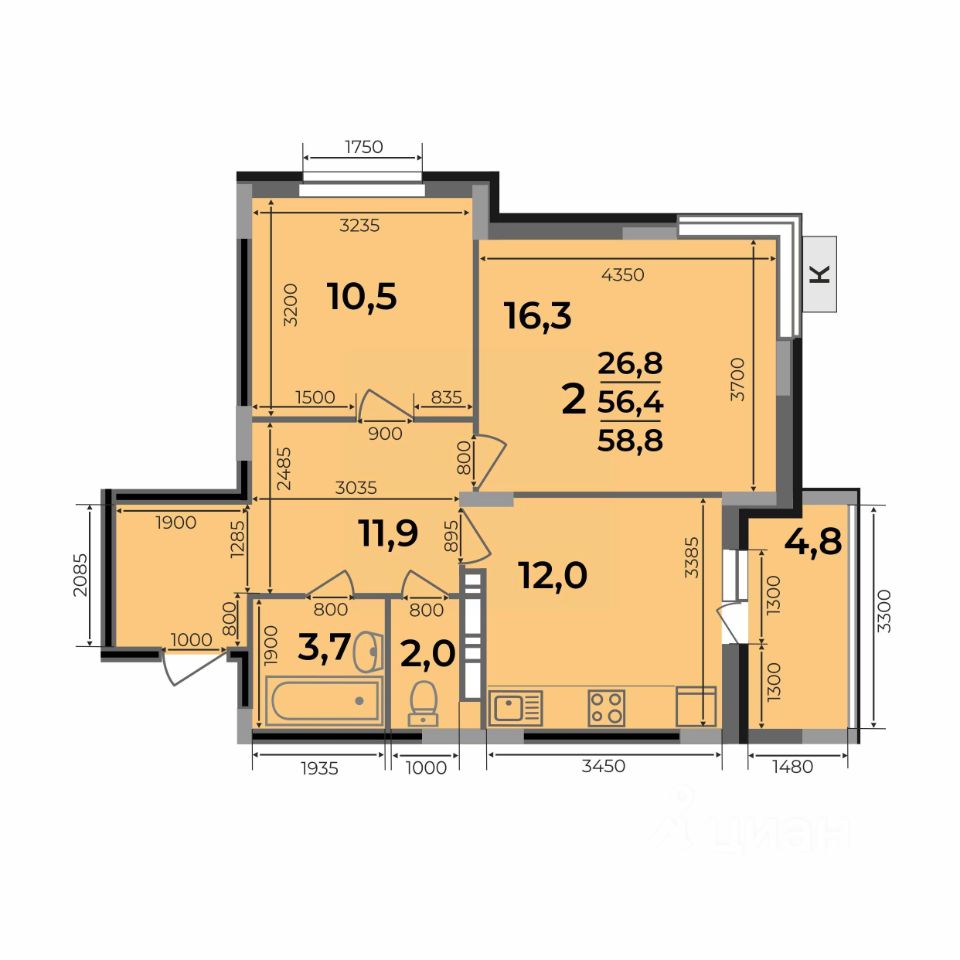 2-комн.квартира площадью 58,8 кв.м с отделкой WHITE BOX в ЖК Маршал (г. Ковров, ул. Еловая, 82). Семейная ипотека. Рассрочка. Трейд-ин.