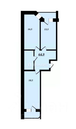 2 комнатная квартира общей площадью 64,9 кв. м, из которых 34,7 кв. м — жилая площадь.