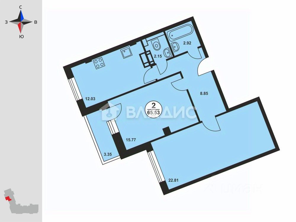 Квартира общей площадью 58,2 кв. м., расположена на 9м этаже 12ти этажной секции.