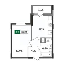 Однокомнатная квартира 36,24 кв.м — это квартира классической планировки с большим совмещенным санузлом 4,8 кв.м, кухней 11,2 кв.м и жилой комнатой 14,24. В прихожей предусмотрена ниша под шкаф-купе.