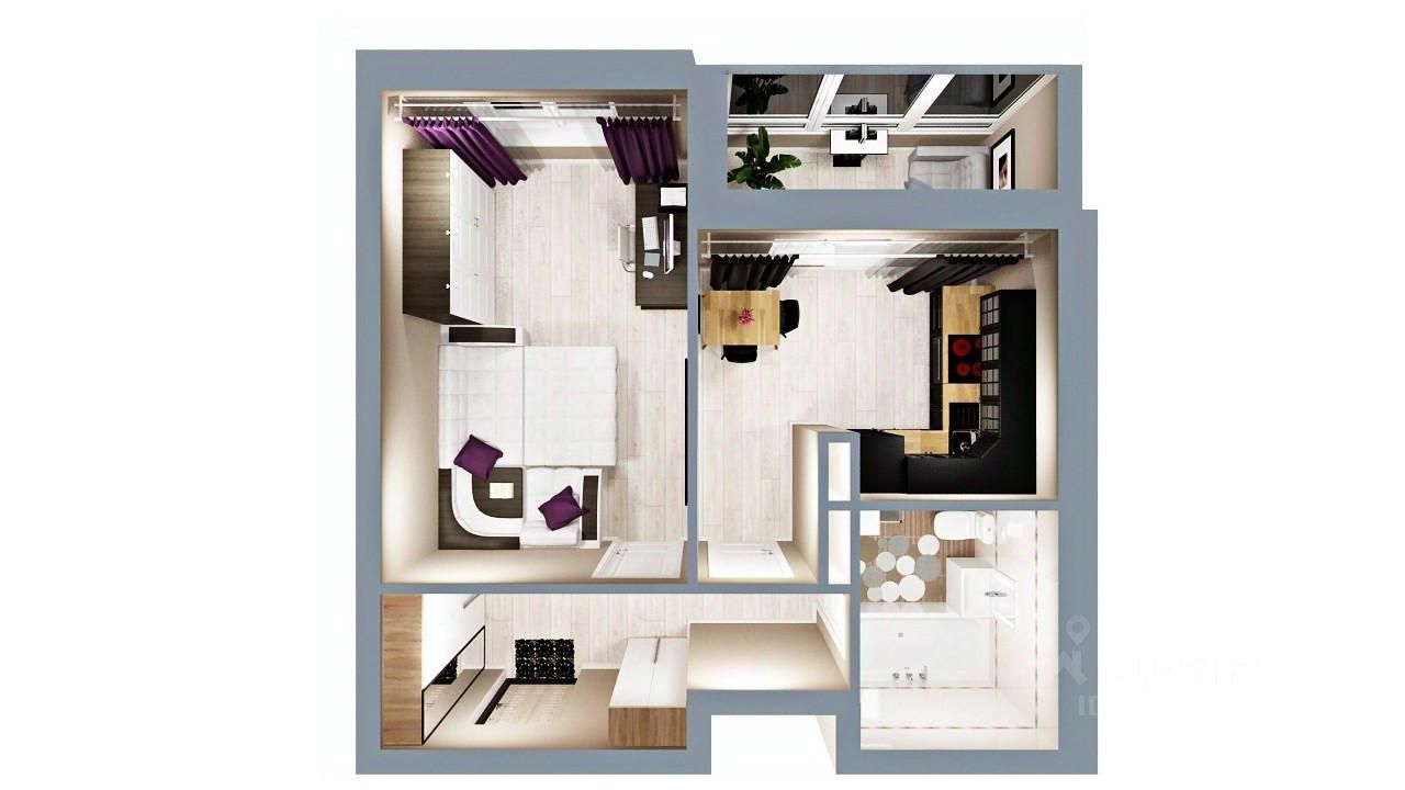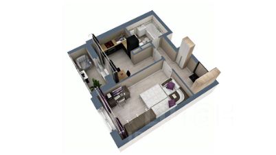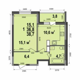 Однокомнатная квартира (38,7 кв.м) - это квартира с совмещенным санузлом, большой жилой комнатой и просторной прихожей. Окна квартиры выходят на внешнюю сторону дома. На кухне расположен выход на лоджию.