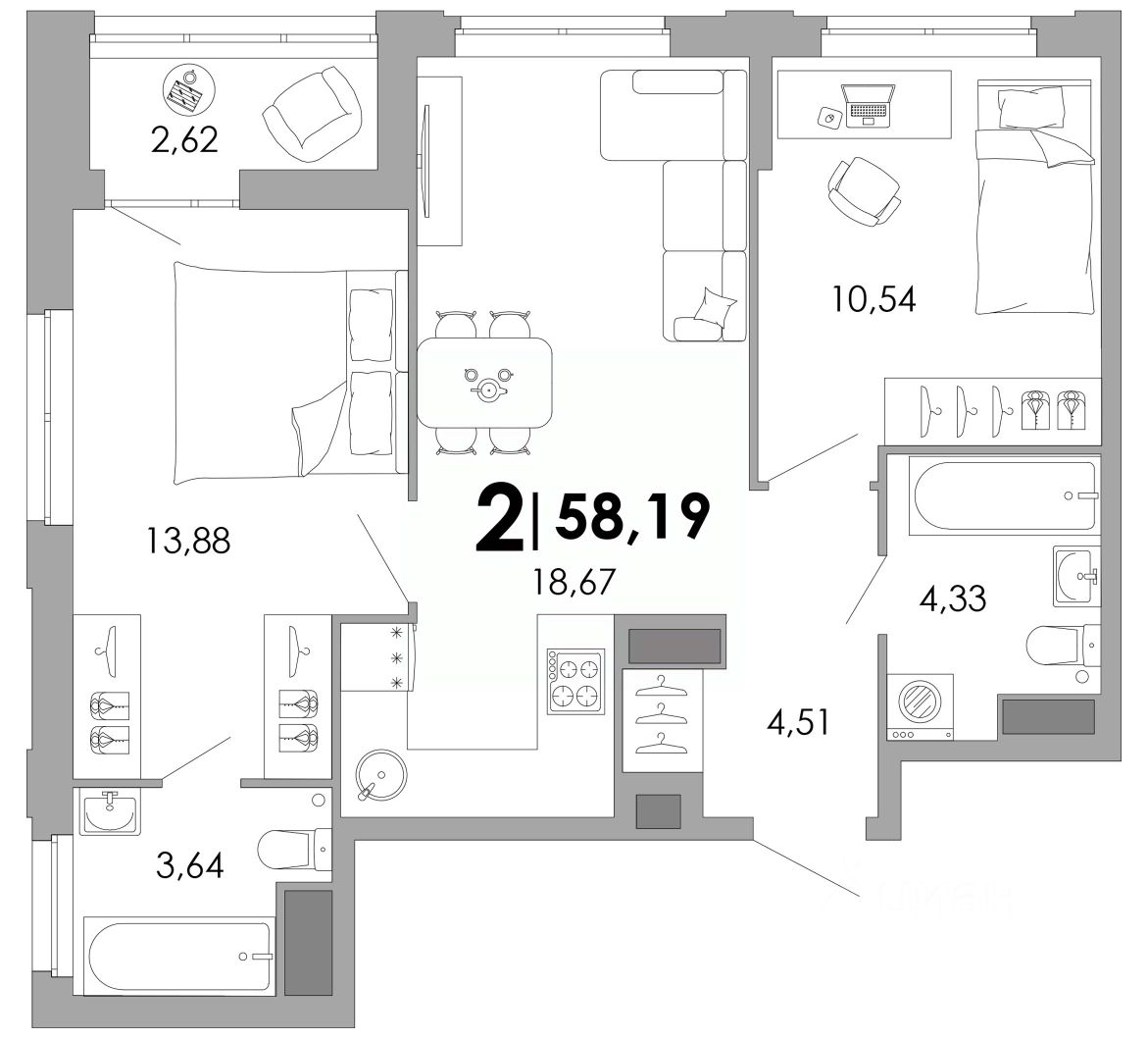 Общая площадь58,19 м²