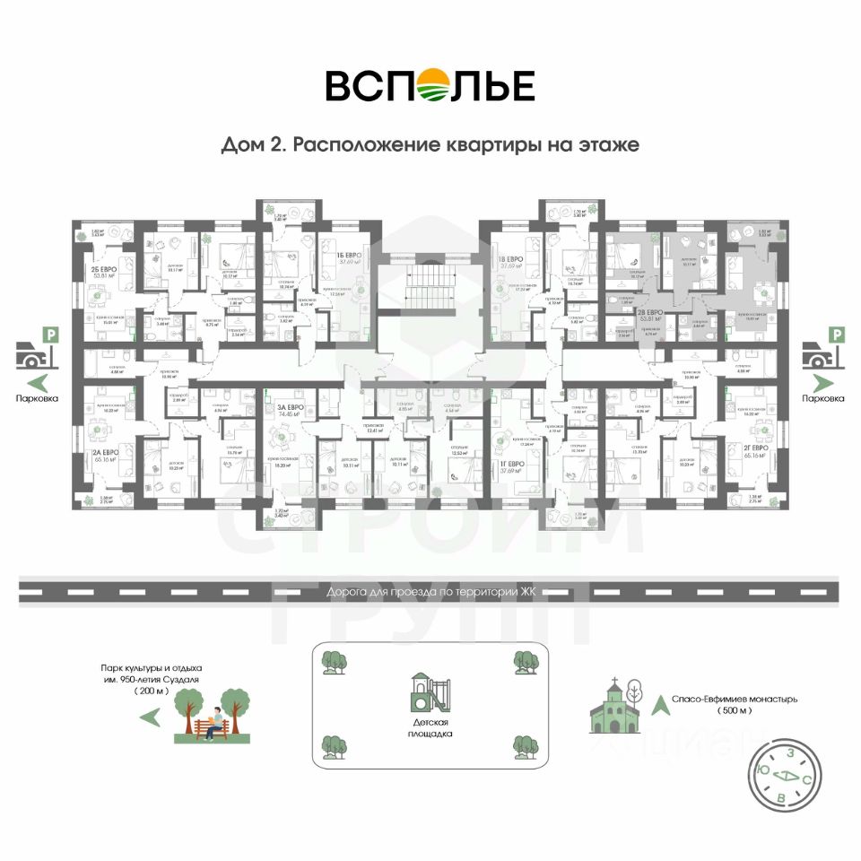 Новый проект от Строим Групп - жилой комплекс Всполье в самом известном туристическом городе России! ЖК Всполье в Суздале это три полностью кирпичных дома, расположенных рядом с одноименной улицей. Отличительной особенностью этого жилого комплекса является присущее компании Строим Групп внимание к деталям. Так, территория комплекса будет огорожена для спокойствия и безопасности жильцов, а на территории помимо самих домов будет размещена просторная парковка и детская площадка с резиновым покрытием. На территории, как и в подъездах, проектом предусмотрено круглосуточное видеонаблюдение. Но самое главное - все квартиры в ЖК Всполье будут сданы с отделкой от застройщика, стоимость которой уже входит в цену квартиры! А купить квартиру в ЖК Всполье можно как в ипотеку с применением любых субсидий, так и за наличный расчет всего за 1 день