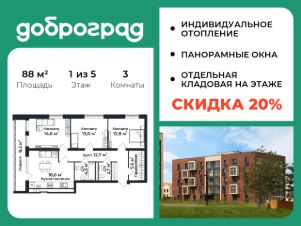 Продается 3-к квартира 88 кв.м. в новом построенном доме по адресу: Владимирская область, Доброград, улица Долголетия, д.2, корп. 3.