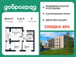 Продается 2-к квартира 60,6 кв.м. в новом построенном доме по адресу: Владимирская область, Доброград, улица Благополучия, д.1, корп. 1.