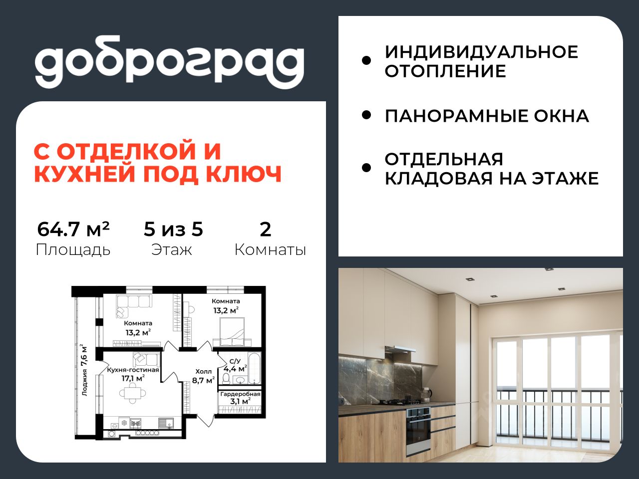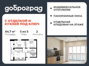Продается 2-к квартира 64.70 кв.м. с полной ЧИСТОВОЙ ОТДЕЛКОЙ И КУХНЕЙ в новом уже построенном доме по адресу: Владимирская область, Доброград, улица Удачная, д.7 корп.3.brbrДом монолитно-блочный, в квартире предусмотрено индивидуальное отопление двухконтурным газовым котлом, что позволяет значительно экономить на комунальных платежах.brbrДОМ СДАН!brbrКвартира находится на 5 этаже 5-этажного дома. На лестничной площадке предусмотрена собственная кладовая комната (келлер) для хранения вещей. В доме есть лифт, просторные входные группы, организован безбарьерный вход в подъезд. Функциональная планировка, большая кухня-гостиная, эффектная лоджия с панорамным остеклением, гардеробная помогут грамотно организовать пространство. brbrОтделка квартиры включает в себя: br- пол - керамогранит/ламинат;br- стены - на кухне, в прихожей и в спальных комнатах - покраска, в санузле - керамогранит;br- натяжные потолки со встроенными светильниками и выводами для подвесных светильников;br- акриловая ванна, унитаз подвесной с инсталляцией, смесители, душевая система, подвесная раковина с тумбой, полотенцесушитель, вентилятор, вывод для стиральной машины;br- выключатели и розетки;br- кухонный гарнитур с врезной мойкой и смесителем, варочная панель, духовой шкаф встроенный, вытяжка встроенная, посудомоечная машина встроенная;br- вывод под кондиционер;br- межкомнатные двери;br- отделка лоджии.brbrРядом расположен живописный природный парк, озеро, места для отдыха и прогулок, качественные игровые площадки.brbrДоброград - это превосходная экология и современная инфраструктура всего в 2,5 часах от Москвы. В городе работает современный образовательный комплекс "МИР" (частная школа и детский сад), муниципальная гимназия. В 2026 году состоится открытие государственного детского сада и физкультурно-оздоровительного комплекса с бассейном. Медицинское обслуживание обеспечивает Первый клинический медицинский центр, расположенный в 12 километрах от Доброграда, а в самом Доброграде работает кабинет врача общей практики.Территория охраняется, въезд строго по пропускам, что гарантирует безопасность Вам и Вашей семье.brbrВ Доброграде организованы необходимые условия для занятий спортом круглый год:br- оборудованные площадки для самых популярных видов спорта,br- крытый спортивный комплекс,br- первое в регионе 9-луночное гольф-поле,br- скейт-парк,br- веревочный парк,br- освещенные лыжные и велосипедные трассы,br- крупнейший в Европе вейк-парк.brbrГород обслуживает собственная управляющая компания, которая обеспечивает бесперебойную работу всех систем, чистоту и порядок на территории.brКвартиру можно приобрести за наличную оплату, в ипотеку, а также с рассрочкой от застройщика. Условия ипотеки и рассрочки уточняйте у менеджеров отдела продаж.
