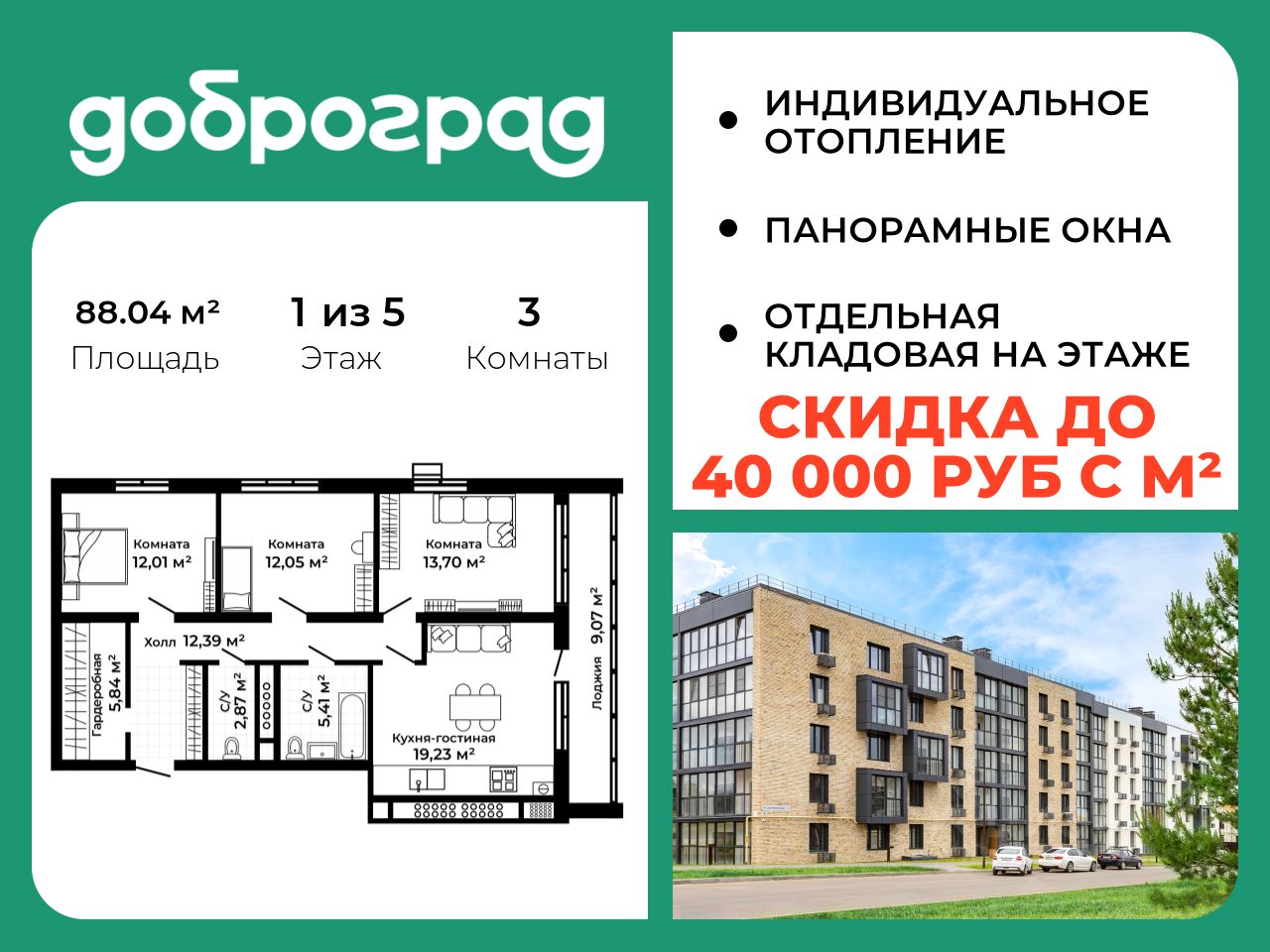 Продается 3-к квартира 88.04 кв.м. в новом построенном доме по адресу: Владимирская область, Доброград, улица Благополучия, д.2 корп.2.