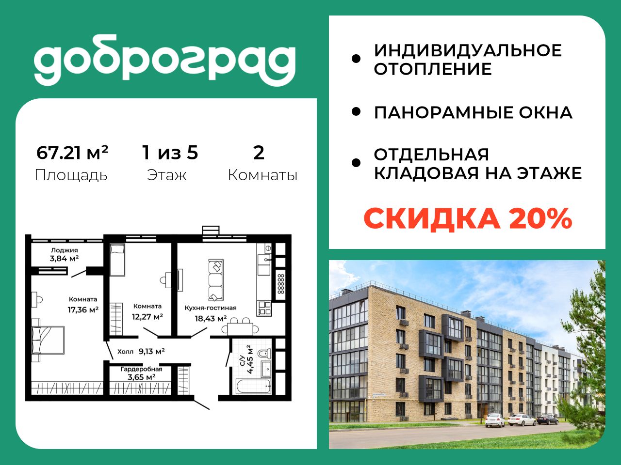 Продается 2-к квартира 67.21 кв.м. в новом построенном доме по адресу: Владимирская область, Доброград, улица Благополучия, д.2 корп.2.