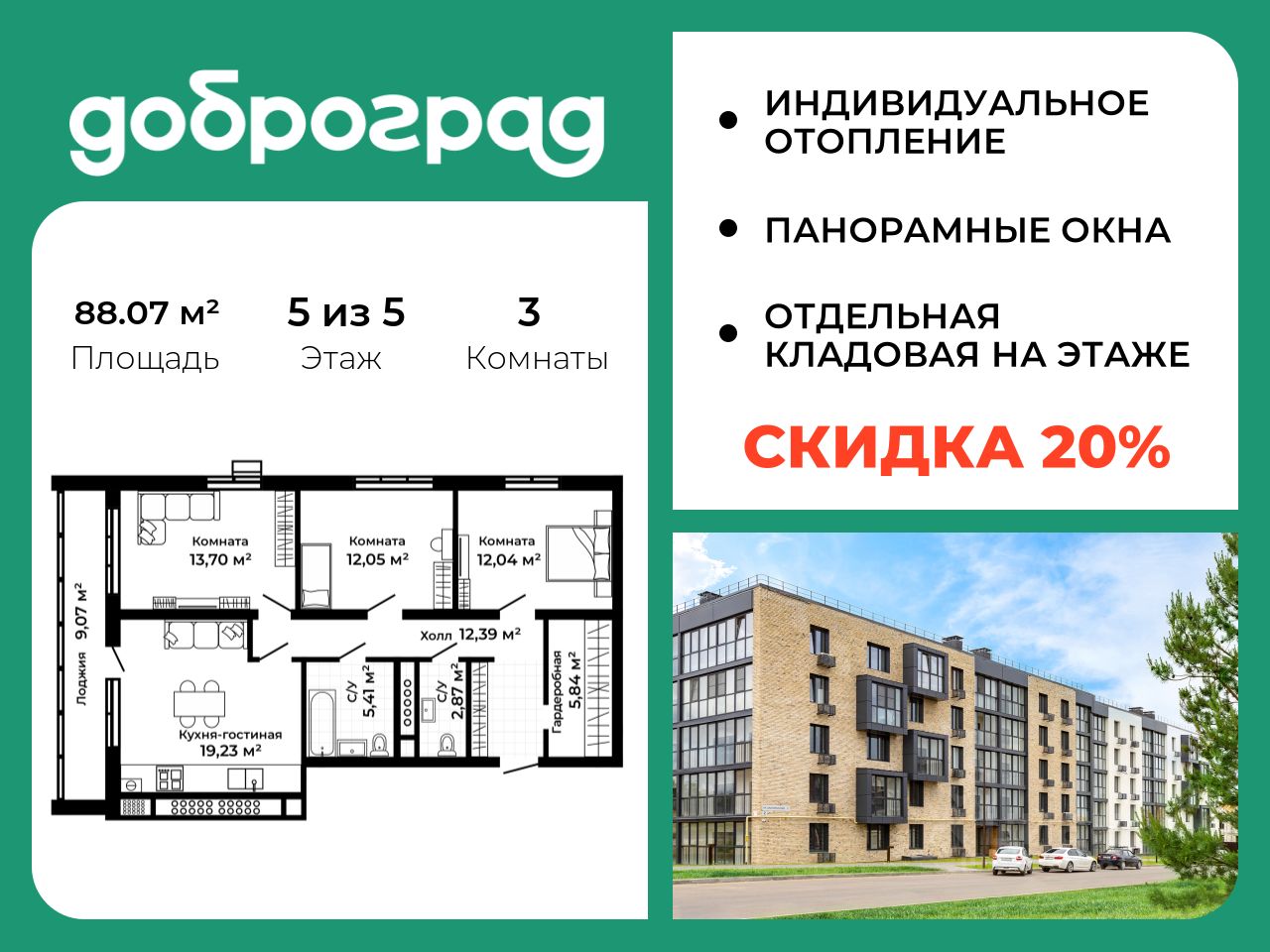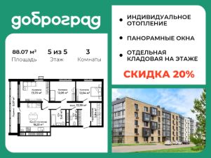 Продается 3-к квартира 88.07 кв.м. в новом построенном доме по адресу: Владимирская область, Доброград, улица Благополучия, д.2 корп.2.